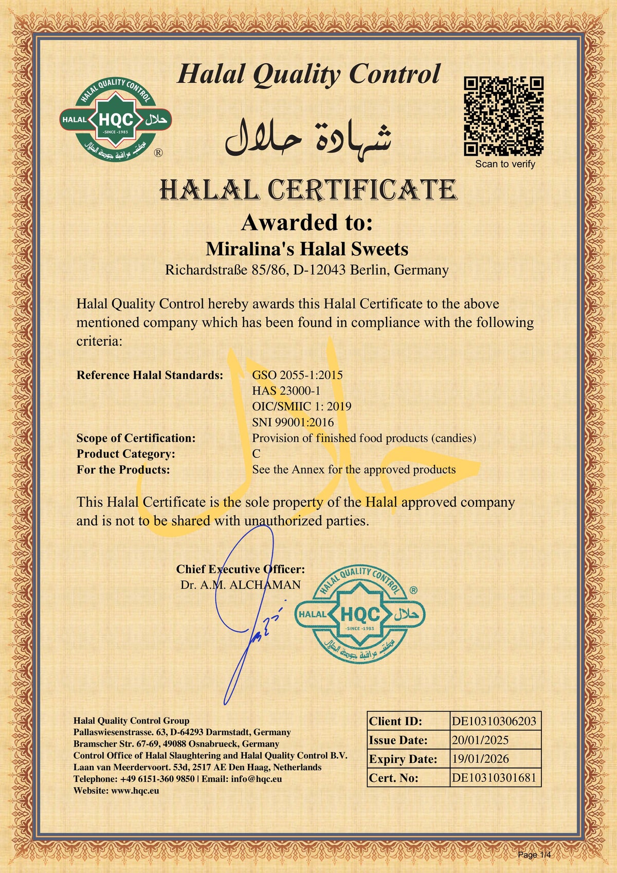 Wir nehmen den Begriff "Halal" ernst und lassen unsere Süßigkeiten vom Institut HQC (Halal Quality Control) prüfen und zertifizieren.