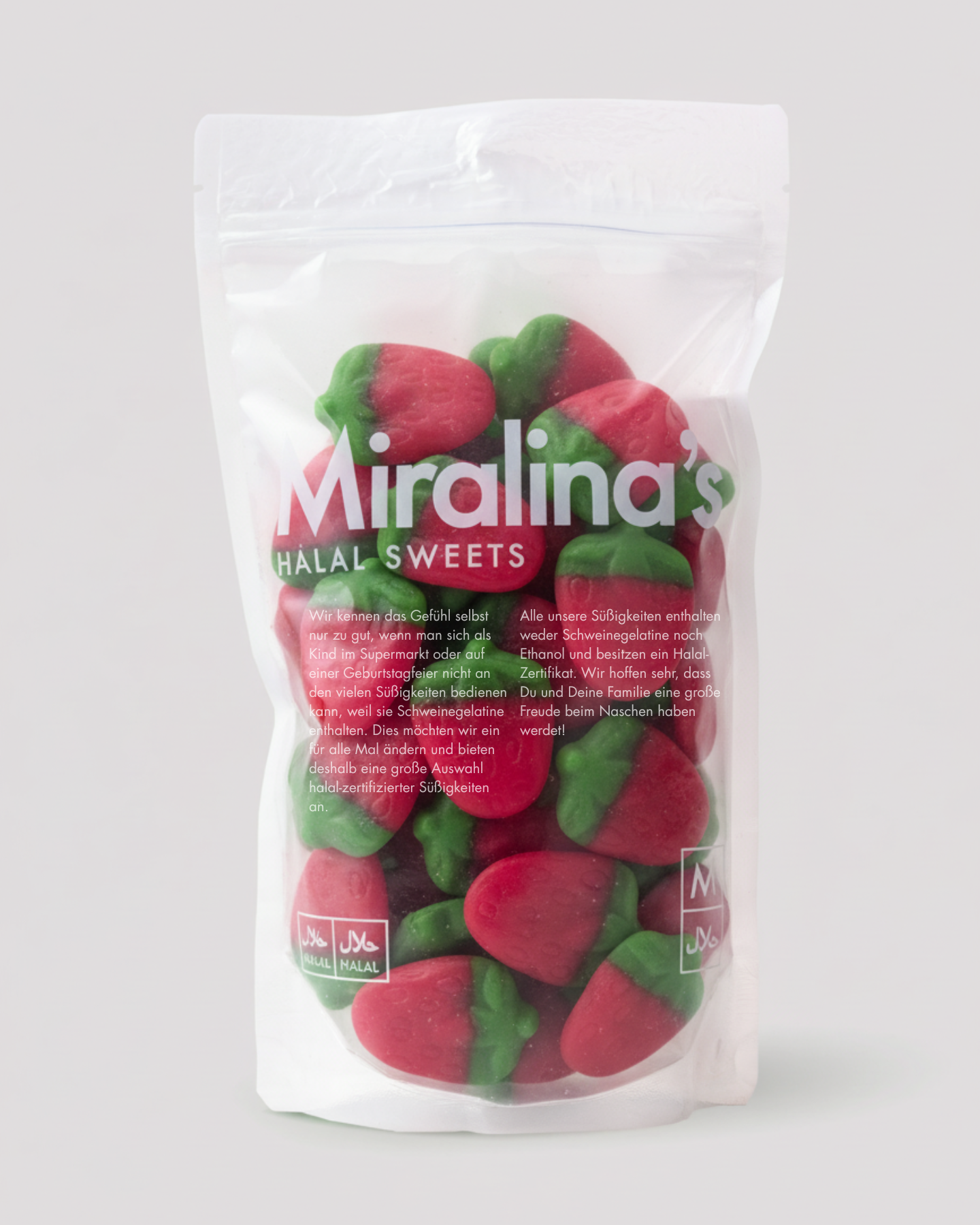 Die Miralina's mit leckerem Erdbeer-Geschmack. In dem Beutel sind 500 Gramm halal Süßigkeiten enthalten. Diese Süßigkeiten sind ohne Schweinegelatine und glutenfrei.